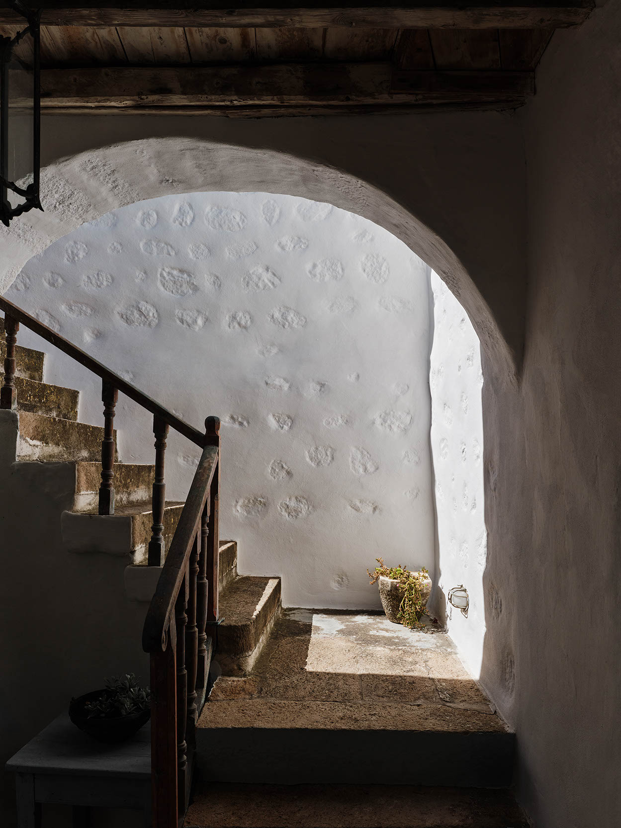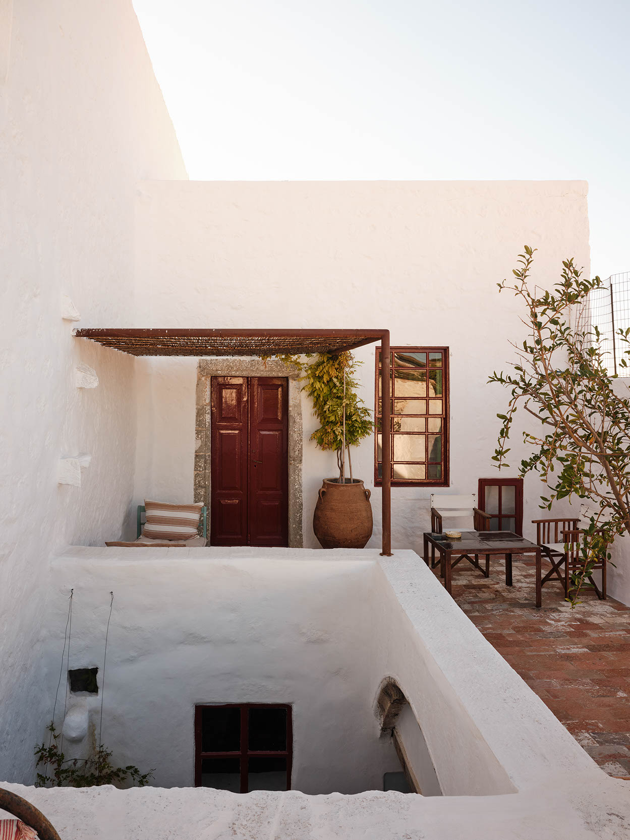 Nestled in the quiet southern quarter of Chora, in one of its oldest neighborhoods, the 211 sqm Ypapanti blends centuries of Patmian architecture. Its ground floor dates to the 17th century, featuring stone arches, select ceilings made of the local astivi plant, original doors, and clerestory windows. The upper floor, added in the early 19th century, reflects neoclassical influences. This traditional Patmian urban house features a multilevel layout, interconnected courtyards, lime-plastered walls, and centuries of local craftsmanship.